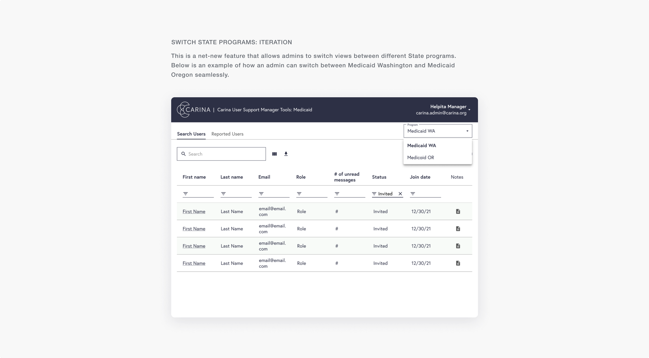 For the new design, we added features in a sensibly dedicated place on the page, making it easy for admins to find and use the features. We also added a feature to switch between State Programs, which was not possible on the old system.