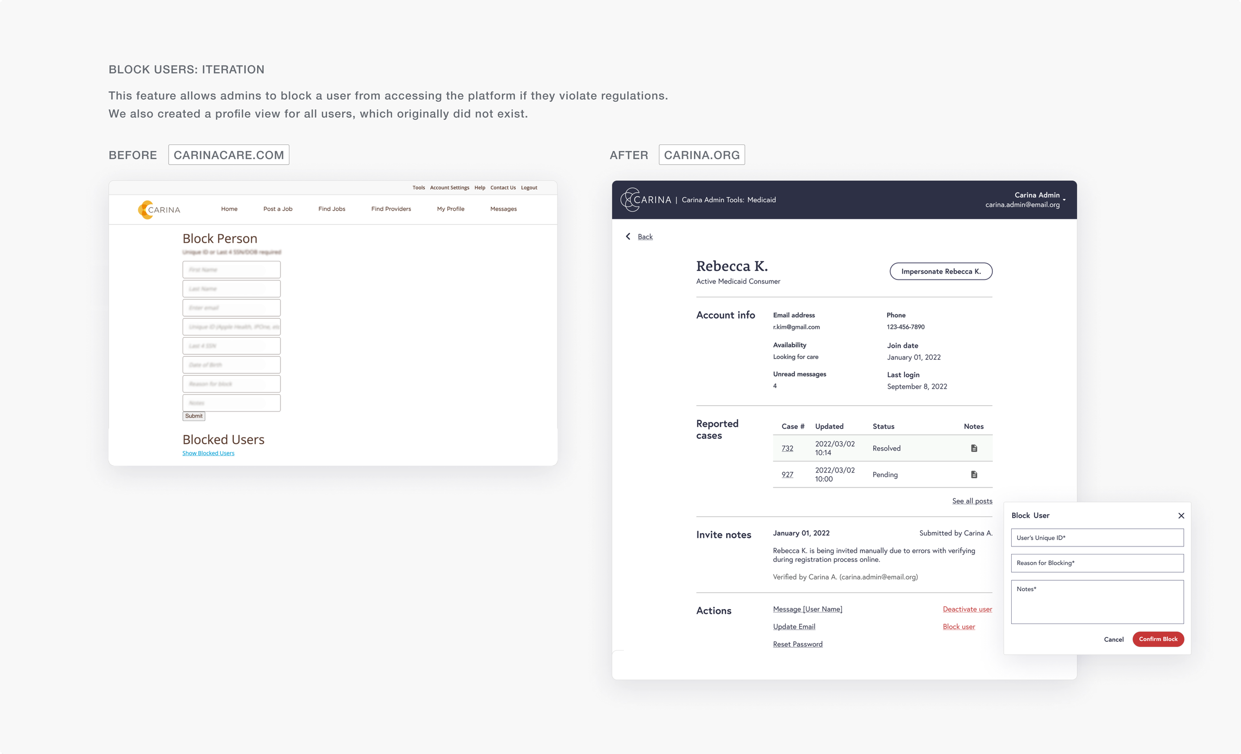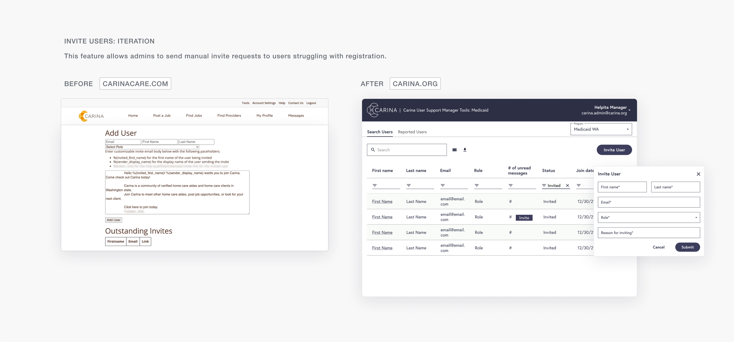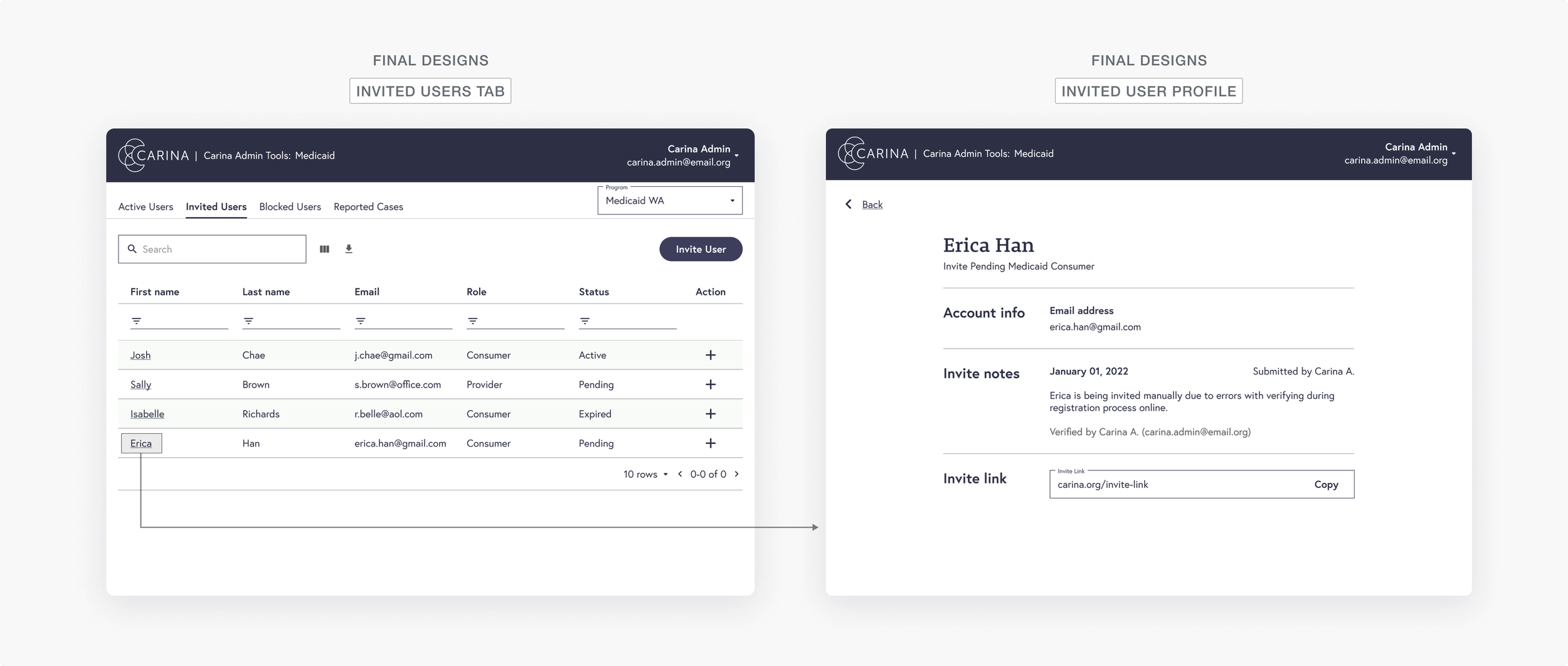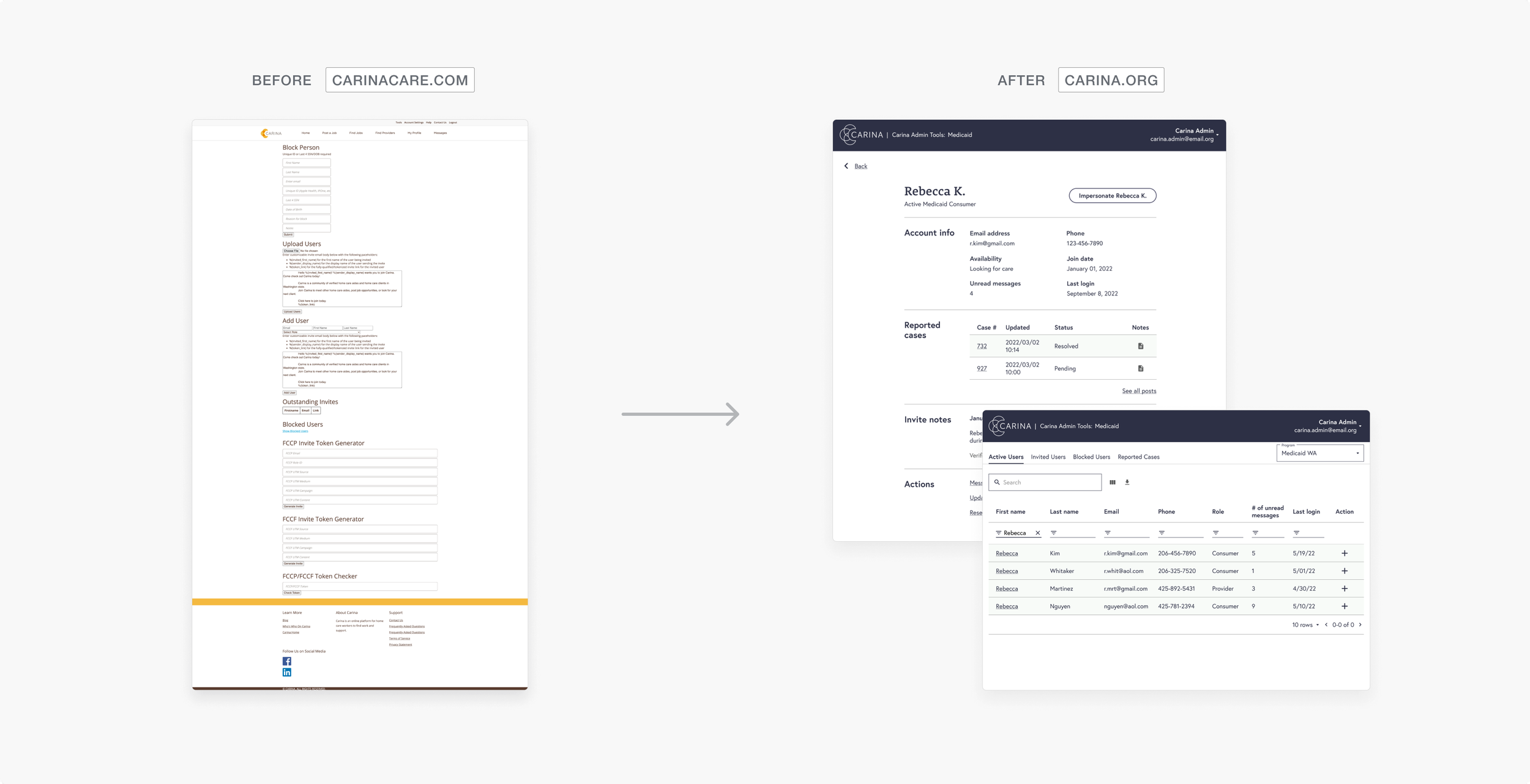 Carina is a care-matching service that has connected caregivers to clients to deliver over 1 million hours of home care since 2017. While Carina continued to quickly expand its services across the nation, we underwent a full-stack migration from carinacare.com to carina.org. During this process, I led the efforts in overhauling the fragmented Admin Tools Dashboard.