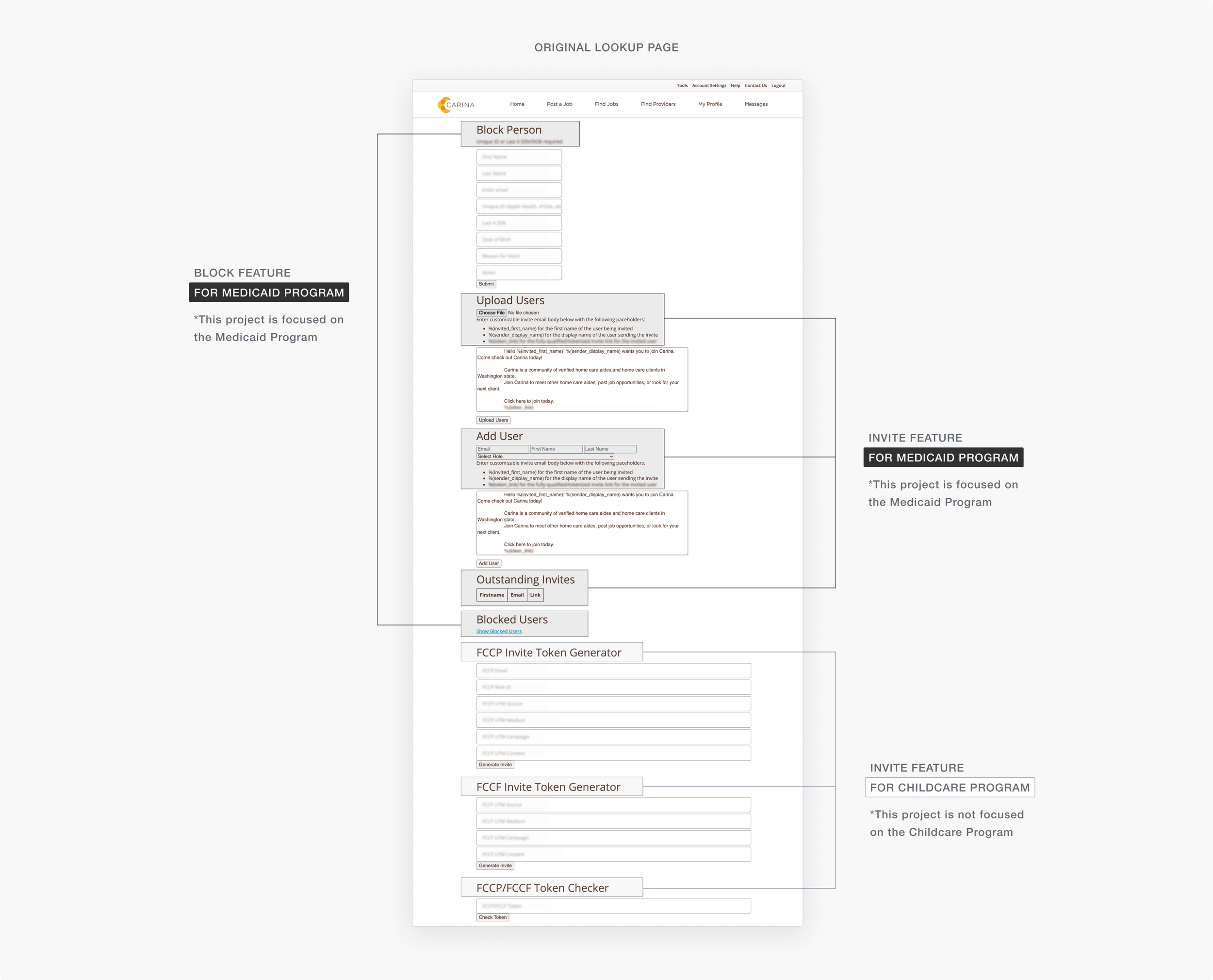 To access all administrative features, admins needed 3 separate login credentials. These logins were spread across two websites: Carina.org and Carinacare.com.
